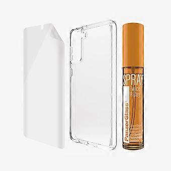 The ultimate PanzerGlass™ protection for Samsung Galaxy S21 Plus. This all-round protection includes a PanzerGlass™ TPU screen protector glass, a clear TPU back cover and a SPRAY Twice a day 30 ml, which gives the smartphone 360* complete protection. Features: Rounded edgesTransparent, crystal clear100% touch-sensitiveOriginal PanzerGlass™ screen protector