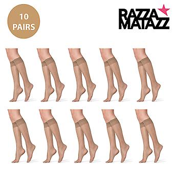 Razzamatazz sheer knee high provides 15 denier appearance with sheer leg finish.10 PairsNatural Beige Colour-No dig band for superior comfort-Reinforced toe for durability-One size fits most