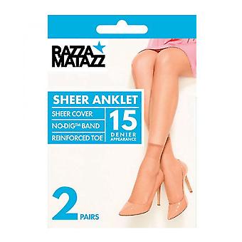 Update your everyday collection with the Razzamatazz 15 Denier Sheer Anklets. This pack features 2 pairs of anklets with a 15 denier sheer matte appearance, reinforced toe and no dig band for superior comfort.Product Features:50 pairs Bulk PackBlack colour Style: H80044No-dig band for superior comfort15 denier sheer appearanceReinforced toeNylon/ elastane construction