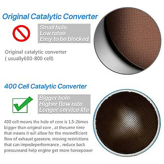2-inch Inlet/Outlet Catalytic Converter Universal High Flow Stainless Steel Specifications: Brand: Caberre Product Name: Catalytic Converter Body Material: 409 Stainless Steel Substrate material: Ceramic Cell Count: 400 Cell Inlet/Outlet Diameter: 2 inch/5 cm inside diameter Body Size: 4inch /10.16cm Round Overall Length: 11 inch / 27.94cm Engine Limit: 2.5L O2 Sensor Port: No Features: - It is resistant to thermal shock and cracking, a long service life. - It has high corrosion and wear resistance. - The main function is to convert toxic gases and contaminants to harmless gases, helping to purify and treat car exhaust. - By using it, it can help to improve exhaust gas flow and save horsepower and torque. - Great emissions control, high efficiency, and work efficiency. Package Includes: 1x 2 Inch Universal Catalytic Converter
