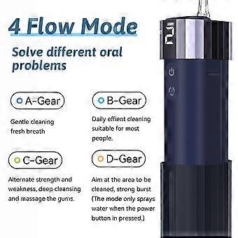 Portable Oral Irrigator Water Flosser Dental Water Jet Rechargeable Water Tank Tooth Cleaner Girl Men Home Christmas GiftOral Irrigator USB Rechargeable Water Flosser Portable Dental Water Jet Water Tank Waterproof Teeth Cleaner Family Travel Chirstmas GiftYour mouth is the gateway to your overall health, so keeping your gums healthy is essential. IPX7 Waterproof/Easy To Fill Water TankThe waterproof design allows you to wash oral irrigator. But long submerging in water is not suggested.4 GearsA gear-Gentle cleaning, fresh breathB gear-Daily effient cleaning, suitable for most people.C gear-Alternate strength and weakness, deep cleansing and massage the gums.D gear-Aim at the area to be cleaned, strong burst(The mode only sprays water when the power button in pressed.)2 Tips& Easy to Carry130ML Water TankMeet your needs of one-time use when you go out for business or travel.Packing List1. Oral Irrigator *12. Professional nozzle *23. Type-C charging cable*14. Manual *1
