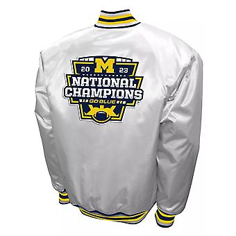 Embroidered fabric applique. Mid weight jacket suitable for moderate temperatures. Inner lining 100g soft polyester quilted. Ribbed on collar, cuffs and waistband. Material: 100% Polyester Satin finish. Stand-up collar Machine wash, tumble dry low. Locker loop. Two front pockets. One interior pocket. Full Snap