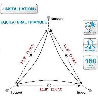 FeatureHIGH QUALITY: Made of 100% polyester fabric with PU coated(, more healthy and safe. Resistant to water, tears and adverse weather conditions. Including three pad eyes. Free giving 3*1800D wind ropes (200cm for each), robust sewing processing on each side, stainless steel D ring on each edge, firmly guarantee fastness of installation.UV PROTECTION: Up to 98% UV protection and 90% Shading rate. Shade sails will lower the ambient air temperature reducing your properties cooling cost and energy consumption. The savings will pay for the Shade Sail´s over time, with the right design.WATER RESISTANT: Water-resistant rating: 400mm HH (Water resistant, not waterproof); Air permeable, allowing a constant circulation of fresh air. Simple and safe installation with rope. Suggests that the installation angle is 20-40 degrees, to achieve maximum tension and also to allow rain to runs off.EASY TO INSTALLATION: Measure and clean the area where the shade sail is to be installed. Leave an allowance of 1.5-2ft between the fixing point and the shade sail to fit hardware/ hooks or ropes. Curved sides to enhance pull strength and prevent drooping, so the actual shading area would shrink slightly, tolerance 4~6 inches for each side. You could install different shade sails of different colors and sizes to get a larger shading area.PRACTICAL & MULTIFUNCTIONAL: Widely used over a patio, lawn, garden, pool, pond, deck, kailyard, courtyard, backyard, dooryard, park, carport, pergola, sandbox, driveway or another outdoor area. Its effectively reducing heat in your outdoor living areas.Specification: triangleStyle function: camouflage, mountaineering, fishing, waterproof, thin, ultra-light, warm, wild survival, adventure, picnicWater-resistant rating: 400mm HHUV PROTECTION: Up to 98% UV protection and 90% Shading rate