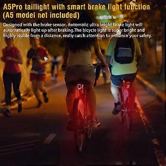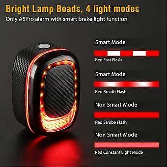 Note1.A5Pro and A5 are both alarm and taillight, A5Pro has automatic brake induction light function, A5 does not have this function, so the price of the two is not the same. Buyers can buy according to their own needs.2.Please fully charge the tail light before use.3.One host can be equipped with three remote controls, and one remote control can also control two hosts.4.We have plenty of stock,wholesalers can rest assured that ordersProduct Features2 In 1 Bike Alarm Tail LightMulti-function anti-theft alarm tail light designed with bike alarm, COB LEDs, and 200-degree wide-angle design, the led bike light will make you more visible for other road users in dark night or daytime. Keeping you safe at all times.A5Pro Smart Brake Sensing TechnologyA5Pro Designed with the brake sensor, Automatic ultra-bright brake light will automatically light up after braking. The bicycle light is super bright and highly visible from a distance, really catch attention to enhance your safety.Extremely Loud 115dBThe bike security alarm can make a loud sound to draw people´s attention. 115dB Loud can effectively scare thieves away, can also be used as a bright taillight, intelligent remote alarm, and bike horn. Two mounting methods for all types of bicycles (please refer to the instruction manual for details)IPX5 Waterproof& USB RechargeableIPX5 grade waterproof bike tail light against splashing water from any angle. Built-in 800mAh Polymer Lithium battery comes with a USB cord that charges from your computer, wall charger, power bank, or any other device with a USB port. After charging for 3 hours, the tail light can work for 2040 hours in 3 different modes. (Slow flash-40h, Breathing flash-30h, Steady on-20h)Easy Mount and RemovableSaddle mounting bracket and adjustable silicone strap provided, make the bicycle rear light flexible to quick install or detach on bicycles, seat post, seat tube bracket. Very convenient to unscrews from the mounting cap for recharging.Specifications- Applicable modelsapplicable to anti-theft alarm and night riding safety warning of electric vehicles, mopeds, bicycles and scooters- Light source: LED COB Red Light- Light Mode: 4 modes (Auto Fast Strobe & Breathing, Manual Pop Strobe& Steady)- Alarm: 105-115dB, 5 horn tones and 3 level volume adjustable- Battery: 800mAH, The running time is about 8-30hrs.- Controller Battery: 12V/27A battery (included), replaceable, not chargeable- Ingress protection: IPX5, water splash proof. Do not submerge in water to use- Mount: Saddle Rail Mounting and Seat Post Mounting- Remote control size:58*35*15 mm- Host size54*36*31mm- Remote control distance10-80M