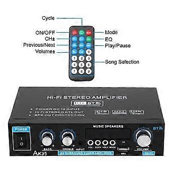 Specification:(AK35)Name: Audio Stereo AmplifierVoltage: 110VImpedance: 4-16Plug: USRMS power: 40Wx2Peak power: 400W x2Load impedance: 4-16Channel: 2.0Signal to noise ratio: 85 decibelsFM frequency: 87.5-108MHzDistortion rate: 0.05%Frequency: 10Hz-20KHzSize: approx. 19x12.5x4.5cm/ 7.48x4.92x1.77´´Packing included:1 x Power Amplifier1 x Remote Control