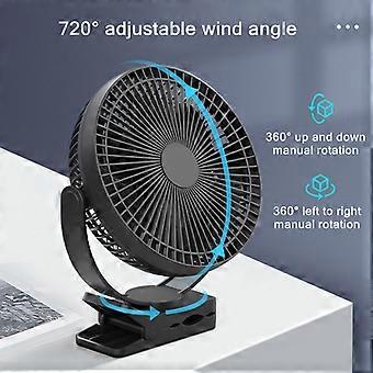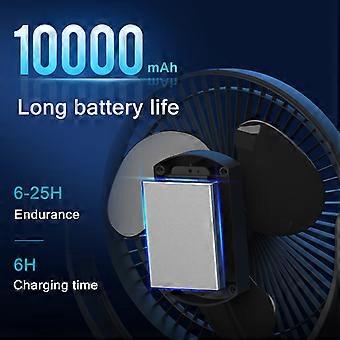 Specifications:Battery type: polymer lithium batteryBattery capacity: 5000mAh/10000mAhUse time: 6-24 hoursCharging method: USB CableFeatures:1. Can be used as desktop fan,stably standing on the table.2. With 7.6 cm big clip,easily clipped in the table corner and bookshelf.3. Built in 5000/10000mAh large capacity battery,longest wireless use for 24 hours.4. Four gears wind adjustable,satisfy different needs in different environment.5. 360 up and down,left to right manual rotation,wider range air supply.6. The wind blow silently,energy-saving and not disturb sleep,study and work.7. Lightweight and portable,suitable to home,office,outdoors,travel,dormitory and camping.8. Removable fan front grille,convenient to clean the fan mesh and fan blades.Package includes:1 x Multi-function fan1 x Type-c cable1 x User manual
