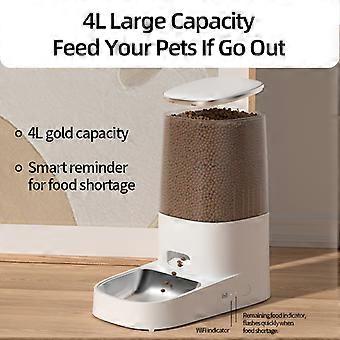 Friendly Tips:1. For any problem, please CONTACT us At Frist. we will help you and will not let you bear any loss. thanks2.The Pet food should preferably be dry food with a diameter of 4-18 mm .3.The Pet Feeder have 2 types: Button Version & WiFI Version, Please Check Carefully Before you buy it which type you want. thanks4. Mobile phone should connect with 2.4G wifi. If your wifi is 5G wifi, please set it to 2.4G wifi.5. It is a normal working state on the Battery mode. The feeder´s screen will automatically turn off if no operation in the 60s, which is entered power saving mode. But it still works by the feeding plan you set. If you need the Screen to light up, just need to press and hold the "Lock" button for 3s to unlock the screen. pls kindly noted. thanks ROJECO 4L Automatic Pet Feeder Cat Food Dispenser Accessories Remote Control Smart WiFi Auto Feeder for Cats DogsCan you imagine a home with pets and no one at home? Pets will hungry, or rummage through items. However, with our 4L automatic pat feeder, you don´t need to worry about these things happening to your pets. It will take good care of your pet and develop a healthy diet and good eating habits for your pets. Our 4L auto cat feeder, which can feed your pet for about 2-3 weeks, suitable for small to medium sized pets. No longer have to worry about early morning, working overtime, traveling and working without feeding.WiFi Version: can set 10 meals per day, up to 60 portions per meal, 62g per portion.Button Version: can set 6 meals per day, up to 60 portions per meal, 62g per portion. Just set the number of meals and the portions, the feeder can automatically feed your pet, no need to get up early, even when travelling, shopping and working.In order to prolong the life of the feeder and prevent the food from being stuck in the feeder, the food should preferably be dry food with a diameter of 4-18mm. Feature:WiFI / Button VersionApp Easy to UseFreshness in Every BiteDetachable design for CleanDual Power Supply (Battery is Not included) Product NameROJECO Automatic Pet FeederModel: PTM-001(wifi) , PTM-003(button)Color: WhiteSize: 335*330*177MMCapacity: 4LWeight: 1310gMaterial: ABS/SUS 304/PCInput Parameters: 5VDC/1AConnection Mode: WIFI/ButtonBattery Requirement: 4 * AA Batteries (Not Included) Attention Please:1,It is not recommended for pets less than three months old.2,It is recommended to use indoors, do not directly expose to sunlight and keep away from fire source3,Please use the original power adapter to avoid the device damage or failure to work4,It is strictly forbidden to soak in water5,To prevent pets from falling over the feeder, it is recommended to place it in the corner or against the wall.6,Children should use under the guidance of adults7,Do not soak the desiccant in water.if damaged,do not continue to use it.8,If you move or stop using the product,please unplug the power cable and remove the bottom battery.9,Except for the maintenance personnel,do not disassemble and repair the product to avoid accidental injury.Installation Instructions:1.Add Food2.Press the lid button to open and add food3.Add Desiccant4.Take off the lid and open the desiccant box, place the desiccant then close it5.Install the Food Bowl6.Place the bowl on ground and main body stuck down, as the picture shows7.Power-On: Connect charging cable to power supply and type-C charging port at the bottom of feeder9.Add Pet dry food and put the lid( Suitable for 4-12mm (0.16-0.47in ) diameter dry food) How to Connect the APP:1.Download the APP "ROJECO" from APP store or Android APP Market2.Then " +Add Device" On the the home page, please connect the device with the reminder3.Note: Please make sure the bluetooth is turn on when connecting to the network for the first time.4.Scan the code to download the "ROJECO" APP How to schedule feeding plan by APP:Set the feeding plan in the APP after connected, it could automatically fed as schedule, also can receive feeding records everytime. How to Manual Feeding:Double click the manual feeding button then give one portion of the food(about 5g) each time.(It also can be controlled by APP) How to Reset Wifi Connection:Hold the feeding button for 5 Seconds, the wifi/bluetooth indicator flash quickly then reset succeeds. Indicator Description:Green light slowly flashes: Waiting for connectionGreen Light stays on: ConnectedRed Light slowly flashes: Lack of foodRed light quickly flashes: Feeder is stuckRed light off: Enough food Questions & AnswersQuestion1: Why network connecting is not successful?Answer: 1.Confirm whether it is tourist mode, please register for the APP account on first using.2. Make