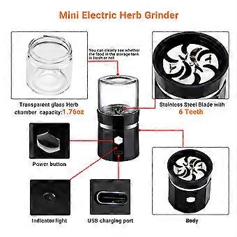 Mini Electric Grinder Portable Vanilla Grinder USB Rechargeable Mill with A Cleaning Brush For Herb Tea Rosemary Coffee and More (Black)Bullet Points:Portable Size: mini-type electric herb grinder is small in appearance, exquisite in craft, comfortable for holding, and easy to carry.Safe to Use:It features short-circuit protection and a child safety lock to ensure more safety in use. And, if the glass jar is not installed, it cannot be woken up and start to work, preventing potential danger.One-Button Operation: After turning on the grinder by pressing the button five times, we can press once to start grinding and press again to stop it. It only takes about 10 seconds to grind and shake completely.Bright Indicator:The grinder is equipped with an indicator light to show its working status. We can see that it glows blue in working mode and red in rest mode.Rechargeable Design: The grinder comes with a USB charging cable so that we can charge it through the USB port of any computer, power bank, etc., which is more convenient and saves the cost of spare batteries.Specification:Product Name: Mini Electric GrindersColor: BlackMaterials: PC/Glass/Stainless SteelSize: 50100mmNet Weight:118gBattery Capacity: 400 mAhCharging Time: 4~6 hoursBattery Life: 2~4 hoursPackage Content:1x Mini Electric Grinder1x USB Cable1x Cleaning Brush
