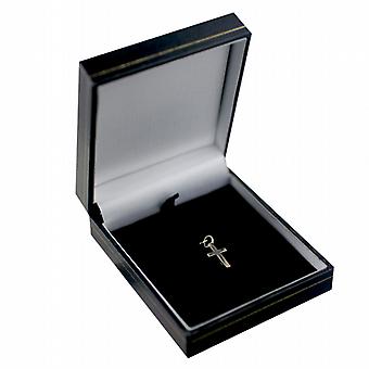 9ct white gold rhodium plated 15x9mm diamond cut four pointed star set with a diamond solid block Cross. Handmade from 2 mm by 2 mm square wire, the back and sides are also plain highly polished. Made and hand polished in our Birmingham factory and comes to you carefully prepared in a black leatherette gift box.